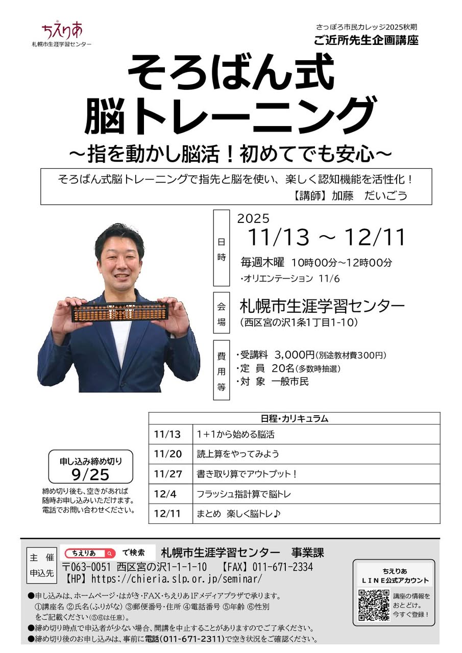そろばん式脳トレーニング札幌生涯学習センターちえりあで講座開催